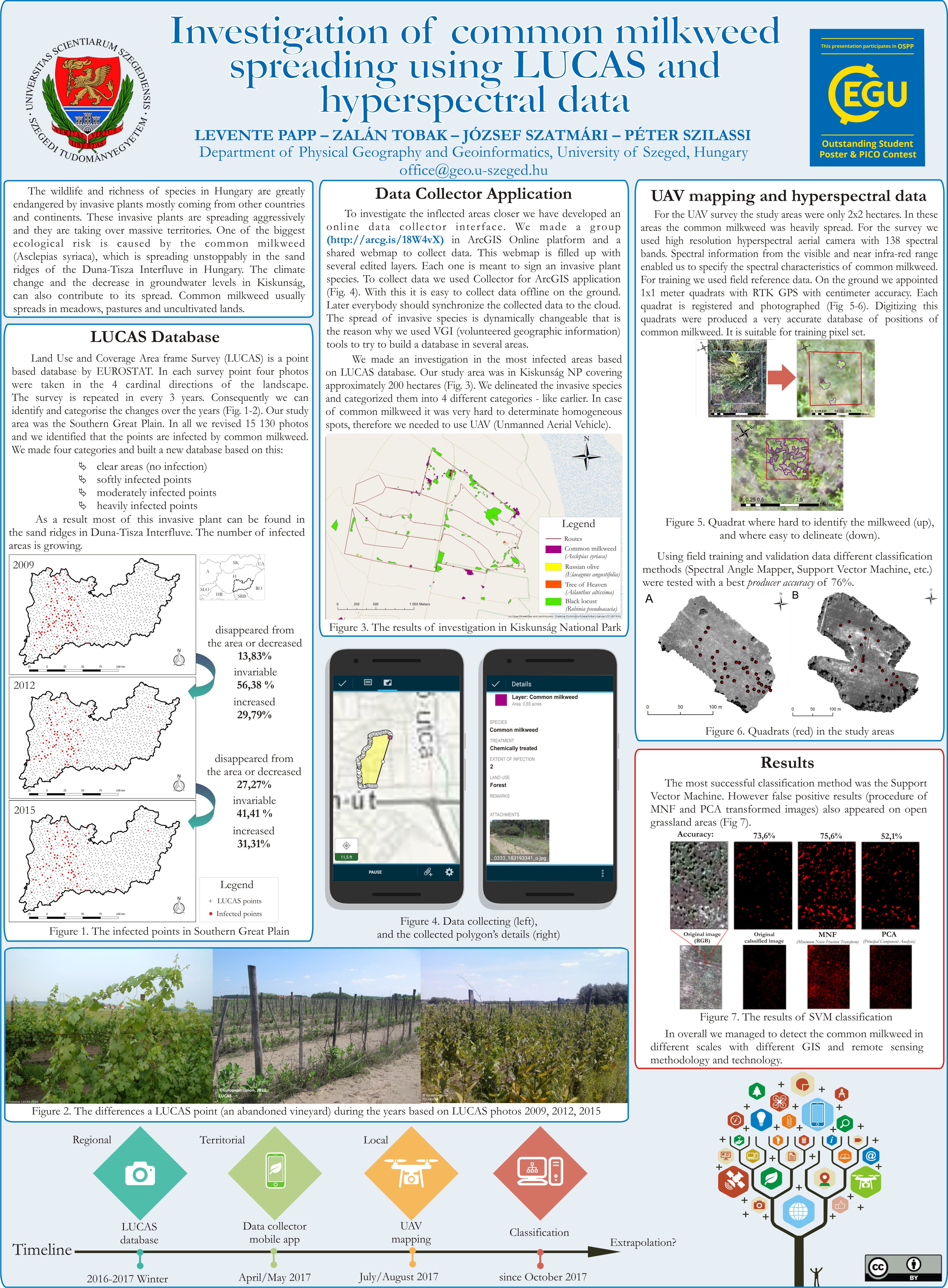 The local-scale UAV survey was carried out with the state-of-the-art Cubert UHD-185 hyperspectral camera and CarbonCore Cortex X8 octocopter in 138 spectral bands at very high spatial resolution as a collaboration with Hungarian Academy of Sciences. Spectral information from the visible and near-infrared range in a highly infected area allowed us to determine the spectral characteristics of common milkweed. Using machine learning, we classified the multidimensional orthomosaic based on field reference data: using sampling quadrats. All quadrats were recorded and photographed, and the resulting database enabled the classification.